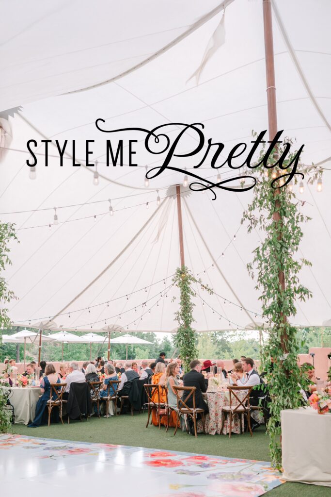 The reception tent was a dreamscape and transformed Bishop’s Lodge into a scene straight from a Pinterest dream. Bistro lights twinkled overhead, strung across the sailcloth tent and wound around poles covered in greenery. The tables were layered with stunning florals and elegant place settings, each napkin embroidered with the couple’s last name initial. The head table was especially unique with round tables arranged in a flowing, caterpillar formation that made the space feel dynamic and intimate. The dance floor carried through the watercolor floral theme, and florals lined the stage where the band played, tying everything together flawlessly.
